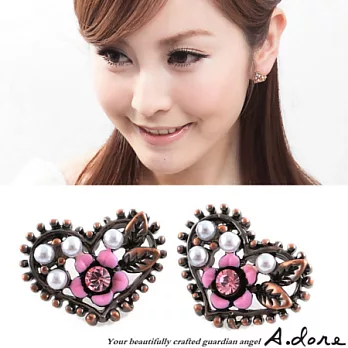 【A.dore】拜占庭愛心˙雕花水晶珍珠耳環-古銅粉紅˙耳夾式